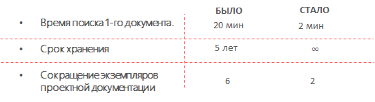 - Сокращение количества физического места для архивирования документации около 10 кв.м. для хранения 1 года;